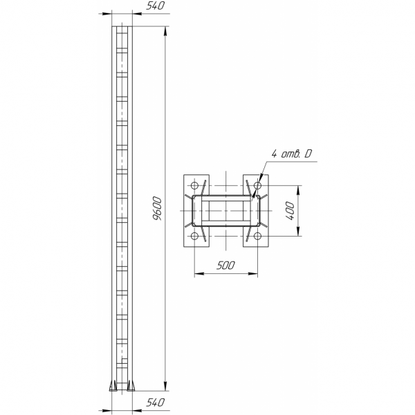 МГП1-10-100 — металлическая стойка опоры контактной сети ж/д из гнутого швеллера, цельная (один пояс), высотой 10 метров, изготовленная из низколегированной марки стали С245.